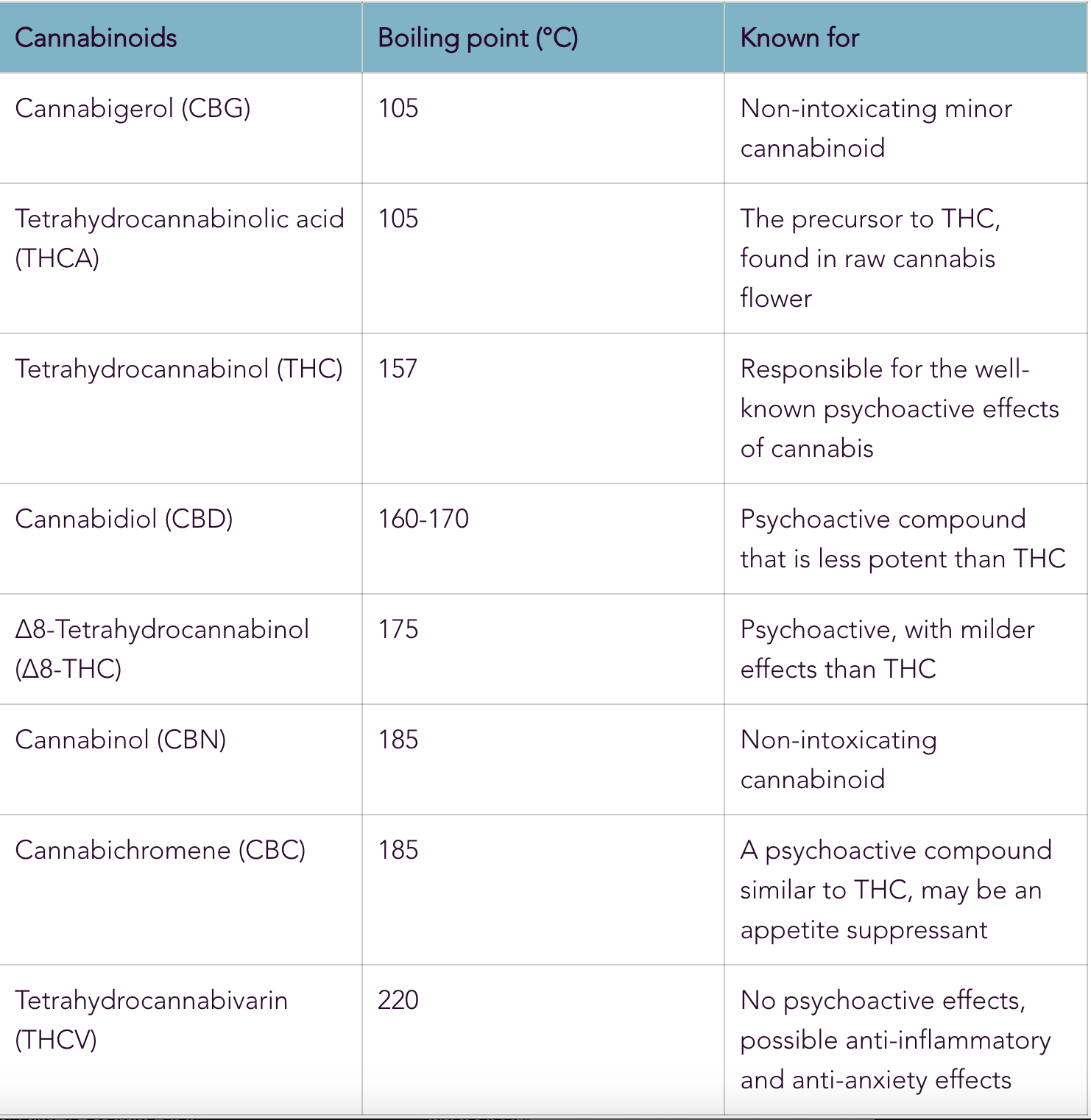 We’ve summarised the boiling points of some of the most common cannabinoids.