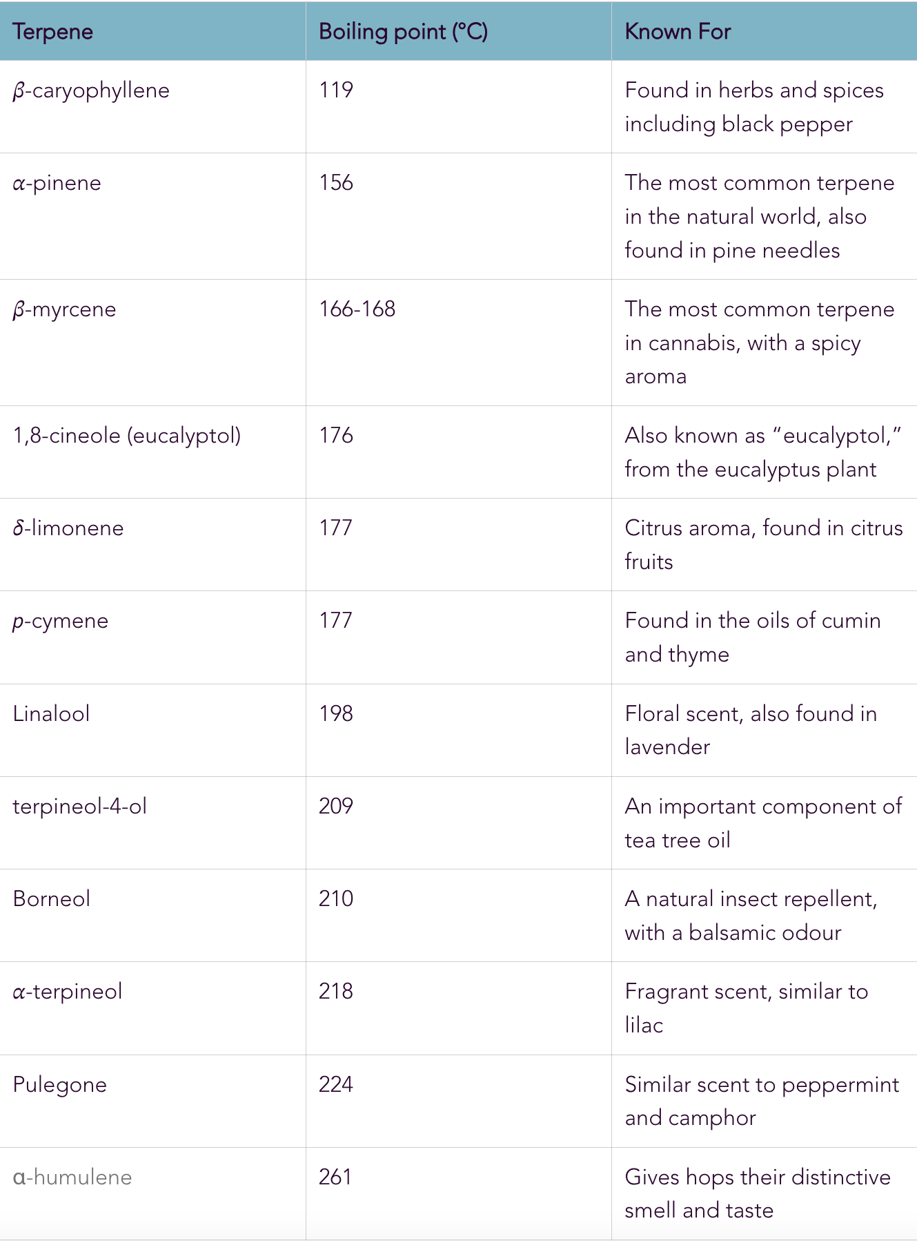 To help you out, we’ve created this handy table, including some of the most common terpenes: